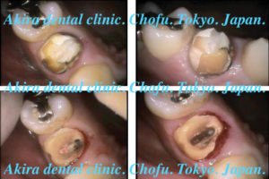 被せ物を除去すると、歯肉縁下にまで汚れが浸透し、歯質が薄くとても弱い状態でした。感染根管治療を進め、根管内を消毒を繰り返し、炎症症状が落ち着き、痛みも無くなったところで、根管充填処置を行い根管治療を終了して仮歯で経過観察した後に最終的な被せ物を装着しました。